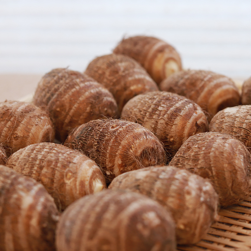 夏に大きく緑の葉を広げ、秋から採れる丸く可愛げのある芋たち。親芋、子芋、孫芋と、形状を受け継いで育つさまは人間のそれと同じです。